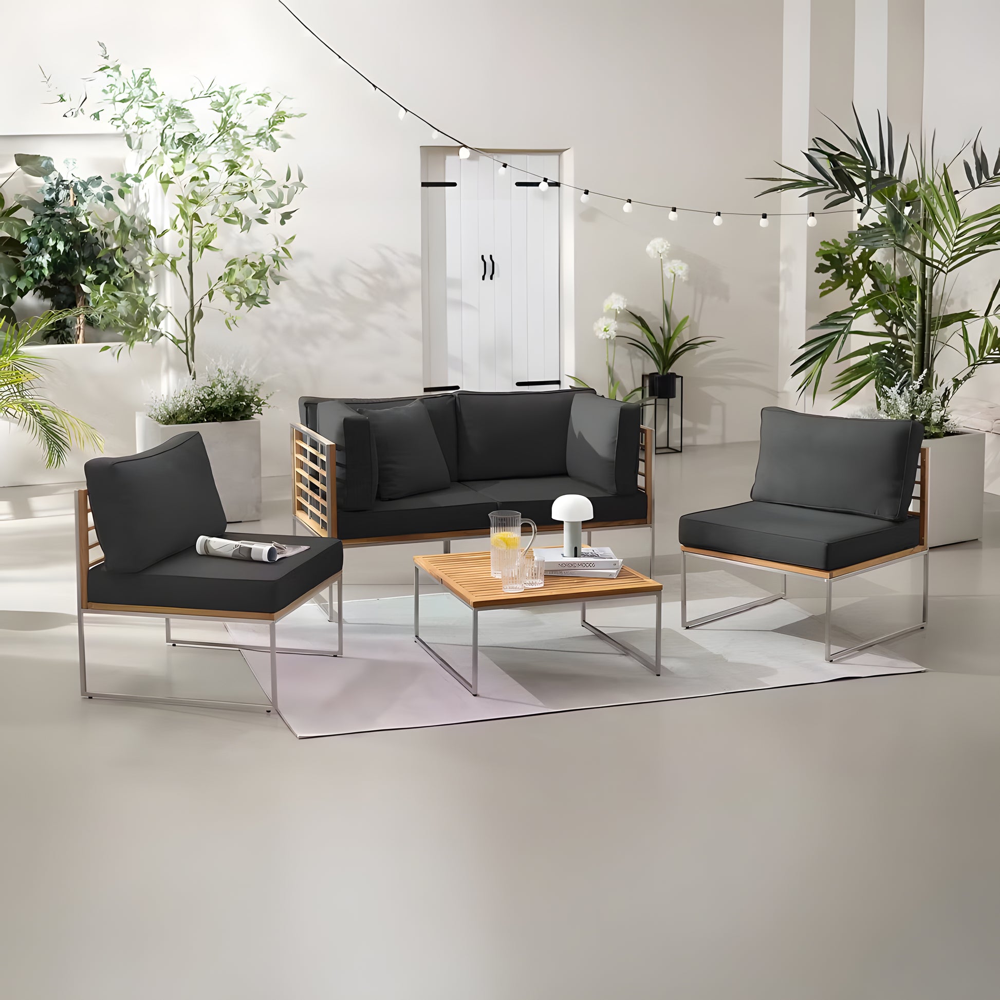 Built to last, the lounge sofa pairs solid teak with rust-proof brushed stainless steel for a sleek, modern look. Its durable, weather-resistant materials ensure long-term beauty, while simple accents like cushions or lanterns let you update your balcony or patio style anytime.
